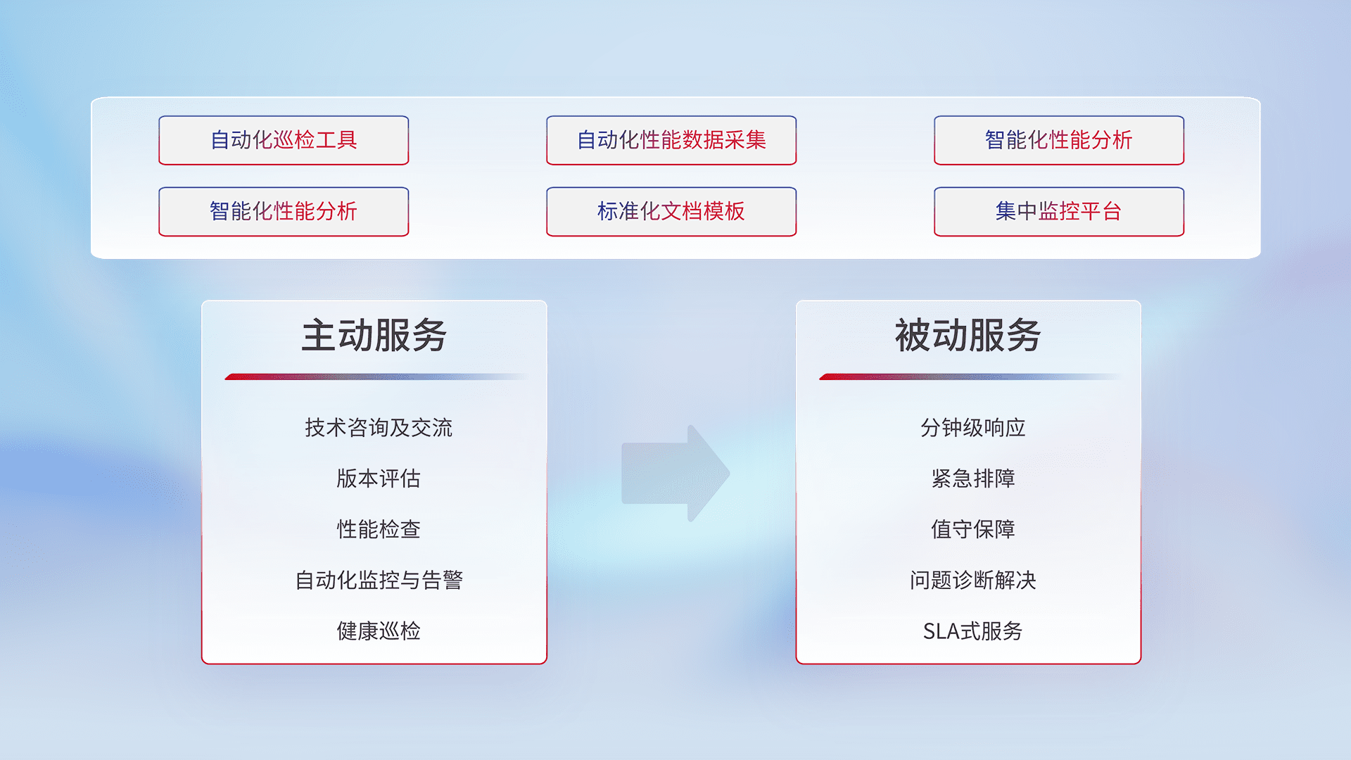 智能化工具和标准化文档,,,保障服务质量,,,提供主动服务(包含技术咨询、、、版本评估、、、性能检查、、、、自动化监控与告警、、健康巡检)和被动服务包含(分钟级响应、、、紧急排障、、、值守保障、、、问题诊断解决、、SLA服务)。。。